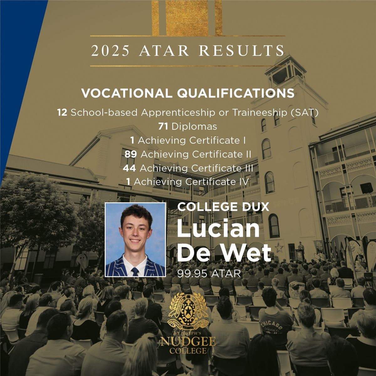 The 2025 College Dux, Subject Duces, and ATAR High Achievers will be acknowledged at the College Assembly on Tuesday, 10 February 2026. We wish each of the 2025 Seniors the very best for their immediate futures. Thank you to the Year 12 parents and caregivers for your dedication to your son’s education. Your guidance and support of these young men is critical to their success.